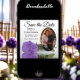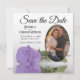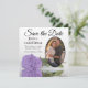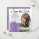 De här vackra datumkorten är det perfekt sättet att låta dina vänner och familj få veta om ditt kommande bröllop. De har en blommigt som är både modern och elegant med en enda lång lavender lila ro som reflekterar i ett bassäng i vatten med vinkara och krämer med ditt foto i en ovalformad färgad. Bildtexten läser Spara datum med utrymme för namnen, datum och plats på en klassisk vit bakgrund. Baksidan är ett marmorerat ljus lila färg.