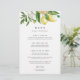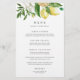 Höj bord-inställningen med det här menykortet för blommigt av citron i eleganten med Redwood & Vine Design Co. Med vattenfärgscitroner, vita blommigtar och snyggt typografi är den här designen perfekt för möhippa, bröllop, repetitionsmiddag eller sommartid i firande. Ett färskt och raffinerat sätt att visa din evenemangsmåltid.