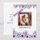 Elegant lila blomma Spara datum, detta vackert designade "Spara datum" bröllopsinbjudan visar ett romantiskt par som kramas på stranden under solnedgången. Omgiven av eleganta lavendel- och violetta blomsterkanter är bilden inramad i ett slående lila, vilket förstärker det varma och intima i parets ögonblick. Inbjudan ber gästerna att bokföra i sina kalendrar för en bröllopsfest på lördagen den 8 augusti 20XX. En perfekt blandning av romantik och stil, idealisk för strand- eller blomsterinspirerade bröllop.