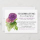 Den vanliga minnesinbjudan som innehåller en vattenfärgsbild av eleganten av djupa lila morgonblommor, grönt blad och en firande av livsstil som lätt kan vara personlig.
