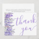 Elegant akvarell lavendelblomma tackkort. Detta platta kort har akvarell lavendelstjälkar som kaskaderar ner på vänster sida på framsidan, med "Tack" som visas till höger i elegant typsnitt kombinerat med klassiska serif-typsnitt. Baksidan fortsätter lavendelblomdesignen för en sammanhängande look. De livliga lila nyanserna och gröna bladen ger en fräsch, modern touch. Du kan anpassa typsnittsfärger och bakgrunder för att passa din stil.