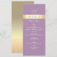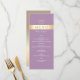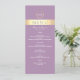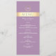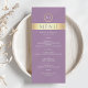 Modern, elegant, lavendel lila och guld folie bröllopsmeny med modernt manus och monogram högst upp.