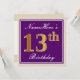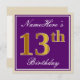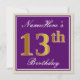 Den här enkla inbjudan och inbjudan från elegant födelsedagsfest innehåller ett personlig som "Namehär's 13 Birthday" (med "13:e" som har ett utseende som liknar guld i utseende och utseende) i ett fyrkantigt område av lila färgad med en enkel kontur av gräns. Namn är i en elegant som är skript som liknar den vita färgaden och kan vara personlig. Information om inbjudan till anpassadet om baksidan har funktioner. Ett födelsedagsfest inbjudan som detta skulle kanske kunna användas när man bjuder in människor till en födelsedagsfest som hålls för någon som firar sin trettonde födelsedag. [~Z0000226]