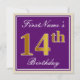 Den här enkla inbjudan och inbjudan från elegant födelsedagsfest innehåller ett personlig som "FirstName's 14th Birthday" (med "14th" som har ett utseende som liknar guld i faux/imitation) i ett fyrkantigt område av lila färgad med en enkel kontur av gräns. Namn är i en elegant som är skript som liknar den vita färgaden och kan anpassas. Information om inbjudan till personligen i baksidan har funktioner. Ett födelsedagsfest inbjudan som detta skulle kanske kunna användas när man bjuder in människor till en födelsedagsfest som hålls för någon som firar sin fjortonde födelsedag. [~Z0000226]