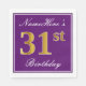 Den här enkla och elegant pappra napkin-designen innehåller ett meddelande som "Namehär's 31a Birthday" (med "31an" som har ett utseende som liknar guld) i ett fyrkantigt område av lila färgad med en enkel kontur av gräns. Namn är i en text som liknar en skript med vit färgad och kan anpassas. Napkins som dessa kan kanske användas i en födelsedagsfest till någon som firar sin trettioförsta födelsedag. [~Z0000140]