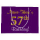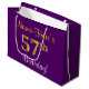 Den här enkla presentsäcksdesignen i eleganten innehåller ett personlig som "Namn-här's 57:e födelsedag!" (med "57:e" som har ett utseende som påminner om guld och utseende) på en lila färgad bakgrund. Namn är i skriptliknande gult-färgad och kan anpassas. En sådan här presentpåse på personligens födelsedag skulle kanske kunna användas när en present eller gåva till någon som firar sin femtiosjunde födelsedag är ge. [~Z0000255]