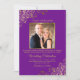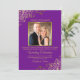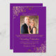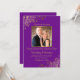 Den vackra bröllopsinbjudan är snyggt, enkel och elegant. Den har guld-skriptbokstäver på en lila bakgrund med blommigt-faux-foliefiligree i varje hörn. I designen ingår ditt foto av bild i ett gyllene ram tillsammans med alla viktiga detaljer. På baksidan finns anpassadet QR-kod och detaljinformation så att du kan skicka gästerna till en webbplats för information och OSA.