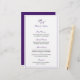 En traditionell meny i bröllop som är klassad på en lakan av papper för ett billigt alternativ. Den här menyn har en enkel design med dina två inledande monogram, namn och kurshuvuden i eleganten royal lila calligraphy. Denna klassiska utformning är perfekt för ett formellt bröllop under hösten/hösten. Bröllop-menyer är ett underbart sätt att lägga till en inslag av stil och formalitet till er speciella dag.