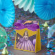 En vattenfärgad illustration av en prinsessa i en luxuriös quinceañera-klänning mot en vit bakgrund. Klädan är en häpnadsväckande lila boll-gryning med ornate guld broderade blommönster längs hem och bodice. Klänningen är utformad på offskulturen med en bodice i passande och en fullt som sträcker sig utåt i cirkelformad form. Prinsessan bär en silver-tiara med kristaller och ett motsvarande halsband med en kristallpanson. Hennes mörk bruna hår är stilt i lös vinkar, och hon har en passande lila som sitter i fläkt. Bakgrunden är dekorerad med färgade pikadonbanderoller av papel i rött, blått, orange och grönt, var och en med vita blommor. Spridningen över hela bilden är små orange- och gröntar-stjärnor, rosa blommor och röda hjärtan. Bilden har en vismisk, sagolliknande kvalitet med mjukt, rundat kant och en drömatmosfär. Prinsessan står i ett tryggt läge med ena handen på höften, centrerad i sammansättningen.