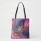 Tillsätt en touch av konstnärlig lyx i din dagliga rutin med denna fantastiska vätskeblandade marmorerade toteväska. Denna moderna design har en hypnotisk blandning av djup violetta, magenta och ametistlila virvlar, kompletterad med falska guld folie strukturer och flytande alkoholbläckeffekter.
