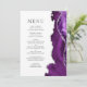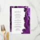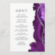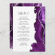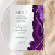 Den moderna bröllop-menyn i höger kant i eleganten har en lila vattenfärgsagat i gräns som trimmas med faux silver glitter. Anpassadet kombinerar grått Roman serif och kopparplatta typsnitt på vit bakgrund. Den omvända sidan har en matchande lila- och silver-agate-design.