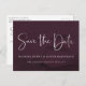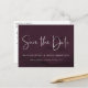 Elegant, vattenfärgsdjup lila-kassibakgrund, bröllop spara datum vykort. Kortet har elegantens calligrafi "Save the Date" (Spara datum), på framsidan och baksidan. Koordinerar blommigtens accent buquet.