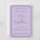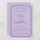 Elegant bröllop Spara datumkortet i lilac-toner med mörk lavender-bokstäver som är tryckta med skript och serif typsnitt inuti ram