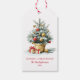 Our wonderful little Christmas tree in a gold pot is elegant and looks great for the holiday season. It is as cute as can be. We love the shiny gold and red ornaments, dusting with snow, and red-ribboned bows on presents under it. It is all done in a watercolor of vintage origin, but you wouldn’t know it because it looks so modern and trendy. Including with the seasonal red typography. We hope you love it too and will enjoy these “Merry Christmas” gift tags for your presents to your beloved relatives and friends this wintertime.