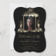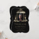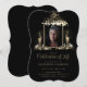 livets firande inbjudan med foto omgivet av gyllene ljus och foto i mitten med chic script typografi mot svart bakgrund.