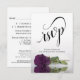 Den här vackra OSA kort gör det enkelt för dina gäster att svara på din bröllopsinbjudan. De har en elegant som är utformad med finare-manusjografi och en enda långvarig lila ro som reflekterar i en bassäng av vatten med vinkara och krämer. Kortets baksida är ett formulär där dina gäster kan fylla i och lämna tillbaka och ange om de kan närvara eller inte, hur många gäster de tar med sig och hur de väljer måltider. Det finns också plats för en webbplats så att dina gäster kan svara på online om det passar dem bättre.