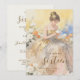 This Sweet Sixteen invitation celebrates youth and elegance with a pastel and romantic style. The illustration shows a young woman wearing a golden and gray strapless gown, surrounded by soft flowers, with a delicately blurred background that adds serenity and harmony. The scene conveys tenderness and joy, capturing a contemplative and charming moment with a watercolor effect that highlights softness and warmth.
