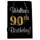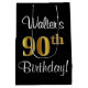 Den här lyxiga, elegant- och snyggt-presentsäcksdesignen innehåller det vanliga numret "90:e" med ett stort utseende som liknar faux/imitation guld, förutom ett hälsning-födelsedagsmeddelande och ett namn som tar emot anpassningsbar i ett teckensnitt som heter script-stil. Den har också en bakgrund med svart färgad. En presentpåse som denna kan användas när en gåva eller present är ge för att hedra någons 90:e födelsedag. [~Z0000513]