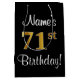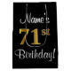 Den här snyggten, den lyxiga och sofistikerade presentsäcksdesignen för födelsedagspressar har ordnumret "71st" som har en imitation/faux guld-inspirerad övertoning mönster, förutom ett hälsning-födelsedagsmeddelande och en personlig mottagare namn i ett skript-stil-teckensnitt. Den har också en bakgrund med svart färgad. En dylik presentpåse på födelsedagen kan vara ett roligt sätt att slå ihop en gåva eller present som ges till någon som firar sin sjuttioförsta födelsedag. [~Z0000513]