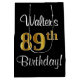 Den här eleganten, lyxiga och snyggtens matade presentsäcksdesign har ordnumret "89:e" som har ett stort utseende som liknar faux/imitation guld, förutom ett hälsning-födelsedagsmeddelande och en redigerbar mottagare namn i ett typsnitt av typen manus-stil. Bakgrunden är svart på färgad. En presentpåse som denna kan användas när man slår in gåvor som ges till någon i firande på 89-årsdagen. [~Z0000513]
