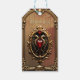 Elegant lyxigt hjärtemblem. Designen har en utsmyckad, välvd gyllene ram mot en gradient brun bakgrund. Ramen är mycket detaljerad med barockinspirerade detaljer. Från toppen av valvet hänger ömtåliga gyllene kedjor med tårdroppsformade hängsmycken. Längst ner i mitten visar en mindre, liknande gyllene ram ett rött hjärtemblem flankerat av bevingade ormar. Den övergripande stämningen är lyxig och dekorativ.
