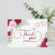 Tacka era bröllopsfestgäster med dessa vackra och genomtänkta kort. Designen visar upp en mängd handmålade akvarellrosor i nyanser av het rosa, magenta och rodnad samt trädgårdsgrönska och eukalyptus. Framsidan av kortet har texten Tack så mycket i elegant modernt skrivstil med svängar och flourisher, och där finns tre söta och romantiska hjärtan. Baksidan har plats för ett personligt meddelande och din signatur. Vacker väg att uttrycka din tacksamhet medan du och dina vänner ser fram emot er bröllopsdag!