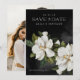 En Elegant Spara datum designat med en vit Magnolia-illustration på svart bakgrund. Kortets baksida kan anpassas med ditt favoritfoto med porträtt.