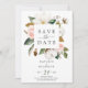 Den här eleganten är magnolia vit för att spara datumkortet är perfekt för ett modernt klassens bröllop. Den mjuka blommigten har vattenfärgade rosor, förbluffande vita magnoliska blommor och bomull med guld och grönt löv i en lyxig arrangemang.