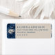 Denna returadressetikett har en sofistikerad design med en balanserad layout, som kombinerar ett mörkt blått blommönster till vänster och en ljusbeige bakgrund till höger. Färgpaletten omfattar djupblått och mjuk krämfärg, vilket skapar en elegant kontrast. Den klassiska serif-typsnittet ger en formell touch, vilket gör den perfekt för bröllop eller speciella evenemang. Anpassningsbara textfält möjliggör personalisering, medan den övergripande stilen utstrålar tidlöshet och förfining.