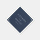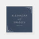 Denna design för brölloppsservetter har en minimalistisk och elegant layout med en djupblå bakgrund, vilket skapar ett sofistikerat och tidlöst uttryck. Den centrala texten är skriven i en ren, modern sans-serif-teckensnitt för namnen, kompletterad med ett stilrent kursivt skript för "och", medan datumet presenteras i ett mindre serif-teckensnitt, vilket ger en formell touch. Geometriska dekorationselement i hörnen anspelar på Art Deco-influenser och stärker den övergripande symmetrin och balansen. De krispiga vita accenterna kontrasterar vackert mot den marinblå bakgrunden, vilket säkerställer läslighet och visuell effekt, vilket gör den perfekt för en förfinad och lyxig bröllopsfirande.