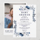 Denna eleganta marinblå countryblomstermönstrade baby shower-inbjudan kan anpassas med din information i modern typografi, ett speciellt foto på baksidan och din presentregister- QR-kod. Designad av Thisisnotme
