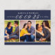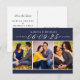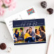 Dessa stilrena bröllopskort för att meddela datum inkluderar tre 2 x 3" förlovningsfoton med datumet skrivet i kalligrafisk skrift. Anpassa kortmallens text på framsidan och baksidan av vykortet för din stora dag. Den marinblå bakgrunden och textfärgerna kan anpassas för att passa ditt brölloppsfärgschema.