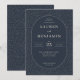 Denna eleganta bröllopsinbjudan har en sofistikerad mörkblå bakgrund prydd med små vita prickar, vilket skapar en klassisk och förfinad estetik. Designen inkluderar en oval ram som centrerar texten, som presenteras i skarpa serif-typsnitt för en formell touch. Anpassningsbara element möjliggör personlig anpassning av namn, datum och platser, medan fasta fraser som "Middag och dans följer" tillför en festlig ton. Den övergripande stämningen är en av tidlös elegans, perfekt för en minnesvärd bröllopsfest.