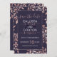 Denna eleganta och moderna bröllopsinbjudan är det perfekta valet för ett klassiskt och formellt evenemang. Den har handritade blomblad klippta i falskt tryckt rose gold-folie ovanpå en dammig marinblå bakgrund med en matchande rosa rosborder runt typografin. Den är chic, lyxig, enkel, söt och vacker!
