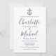 Elegant marinblå script nautisk ankarbröllop inbjudningar