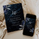 Detta eleganta bröllops-kort för att spara datumet har marinblå blomsterbuketter som framhävs med silverfärgad falsk foliegrönska i två hörn, på en bakgrundsbild av marinblå akvatint-agnat. Den anpassningsbara texten kombinerar silvergrå serif-, kursiv- och handskriftsstilar. Baksidan har en matchande marinblå och silverfärgad blommig och agnat-design.