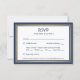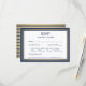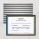 Komplettera marinblå och guldfärgade festerinvitationer med eleganta svarsbrevskort för RSVP. All text är enkel att anpassa eller ta bort vid behov. Kortet innehåller måltidsval och möjlighet att svara via webbplats eller e-post. Den marinblå, vita och guldfärgade designen har en modern falsk folie-kant, klassiska ränder och vintage Art Deco-inspirerad typografi. Detta annonskort är ett stilfullt sätt att begära att vänner och familj svarar på din kommande festdag. Observera att guld är tryckt färg, inte metallisk folie.