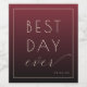 This elegant wedding wine label features a sophisticated maroon gradient background with the phrase "BEST DAY ever" in a mix of bold serif and graceful script typography, creating a balance between formality and whimsy. The design is minimalistic, focusing on clean lines and negative space to highlight the celebratory message. Perfect for commemorating your special day, this label offers a customizable date option, making it ideal for personalizing your wedding celebration. Its warm tones and refined style convey a mood of excitement and significance, ensuring your event feels both memorable and stylish.