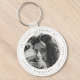 Elegant, chicens budgetnyckelkedja för begravning är viktig för att fira minnet av din kära i en modern minimalistisk utformning av stil på en ren vit bakgrund. Utformningen kan enkelt vara personlig med ditt eget foto och din egen text för att skapa en speciell hyllning till din älskade persons begravning, minnesmärke eller firande i livet. Bilden som visas är endast avsedd som illustration för att ersättas med ett eget foto. Platshållarbilden är av en vacker kvinna med mörkens läderhår på halsduk och är i svartvitt i svartvitt.