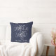 Elegantens kvadrataccentkudde för lycklig par och nylweds har ett vitt skript, Mr. och Mrs. design med anpassningsbar monogramtext som kan vara personlig med det gifta efternamnet. Mörken med midnattsblå bakgrund i färg kan anpassas för att samordna med ditt hem- eller sovrumsskår färger.