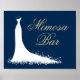 Bröllopsbröllopsdusch mimosa bar skylt / affisch för den stiliga blivande bruden har en flödande bröllopsklänning design, anpassad text som kan anpassas. Vita, marinblå (kan anpassas) och champagne guld / tan färger.