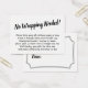 Om du är värd för en visning som inte är en gåvbrytning för att bli brud, kan du välja roligten med ett enkelt kort. Med hjälp av ett typsnitt för eleganten lade jag först till ett huvud med texten "Ingen figursättning behövs!" på framsidan och "Till" och "Från" på presentsidan för märkrn. Mallen fält har upprättats för att ge gästerna instruktioner om att inte fylla i sin present. Var vänlig och ändra ordalydelsen på det sätt du vill. Det finns många populära alternativ till denna text, om ni vill ha en ändring. Alla typsnitt och färg kan ändras efter behov. designad av Melody Watson för Pappra Muserie.
