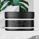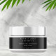 En elegant minimalistisk etikett för kosmetikburk med svart bakgrund, vit text och vit kant.