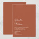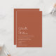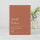 Minimalistisk bröllopsinbjudan med en klassisk design med det lyckliga parets namn i ett elegant skrivstil ovanför de speciella bröllopsdetaljerna på en terrakotta-bakgrund. Designad av Thisisnotme