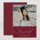 Ett enkelt tillkännagivande från studenten som visar studenten överst med "Student" som visas i ett vitt, modernt kalligrafiskript nedan på en burgundisk bakgrund. Anpassa bilden till studenten genom att lägga till studenten, student namn och namn. Kortet återgår till visningen en burgundär och vit diagonal rand mönster. Det burgunska studenten-meddelandet är perfekt för både högskolan och högskolan studenter.