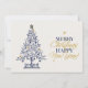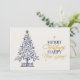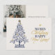 Moderna julkort med marinblå och guld färg med foto erbjuder ett polerat och festligt sätt att fira säsongen samtidigt som de visar din familjs personlighet. Framsidans design har ett handritat marinblått julgran dekorerat med minimalistiska gyllene ornament och krönt med en guldstjärna, tillsammans med ett djärvt, typografiskt julmeddelande i alternerande klassiska serif- och flytande guldskriftstilar. Baksidan av kortet har plats för ett personligt foto och ett hjärtligt meddelande, som kombinerar traditionell värme med modern design. Den rena vita bakgrunden förstärker den marinblå och guld färgpaletten, vilket ger detta platta kort en skarp och sofistikerad look som sticker ut i julposten. Perfekt för familjer, par eller individer som uppskattar elegant enkelhet, är detta kort perfekt för att skicka glädje, tacksamhet och kärlek med en personlig touch. Designad för att göra ditt meddelande minnesvärt, blandar den konstnärlig charm och personligt uttryck