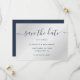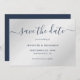 Elegant marinblått kort och silver bröllop spara datum-kort med ett modernt typsnitt. Matchande objekt är tillgängliga.