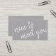 Minimalistiskt, enkelt och modernt "trevligt att träffa dig" kalligrafi hälsning på grått-affärskort. Det är ett elegant- och miljövänligt (miljövänligt) kort för vilken professionell som helst, konsult, insida-designer, florist, bröllopsfixaren, marknadsföring-specialist, social-media, entreprenör, småföretag, kläder, mode-designer, kock, bakverk med mera. Anpassa med namn, befattning, kontakt, adress, social-media och webbplats!