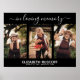 Denna eleganta minnesposter har handskriven kalligrafi 'In Loving Memory', 3 fotografier med era nära och kära namn och datum. Detta är en underbar poster att visa upp vid en begravning, vaka eller minnesstund. Bakgrunden kan ändras till valfri färg genom att klicka på knappen 'Anpassa ytterligare'.