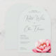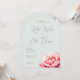 Denna eleganta bröllopsinbjudan har en mjuk, blek mintgrön bakgrund som sätter en lugn och sofistikerad ton. Designen inkluderar en stor, detaljerad illustration av en rosa peonyblomma på höger sida, vilket ger en touch av romantik och naturlig skönhet. Anpassningsbara skrivstilsfonter framhäver parets namn, medan rena seriffer typsnitt ger evenemangsinformation, vilket säkerställer klarhet och elegans. Den övergripande layouten balanserar text och bilder harmoniskt och skapar en inbjudande atmosfär som är perfekt för en formell firande.